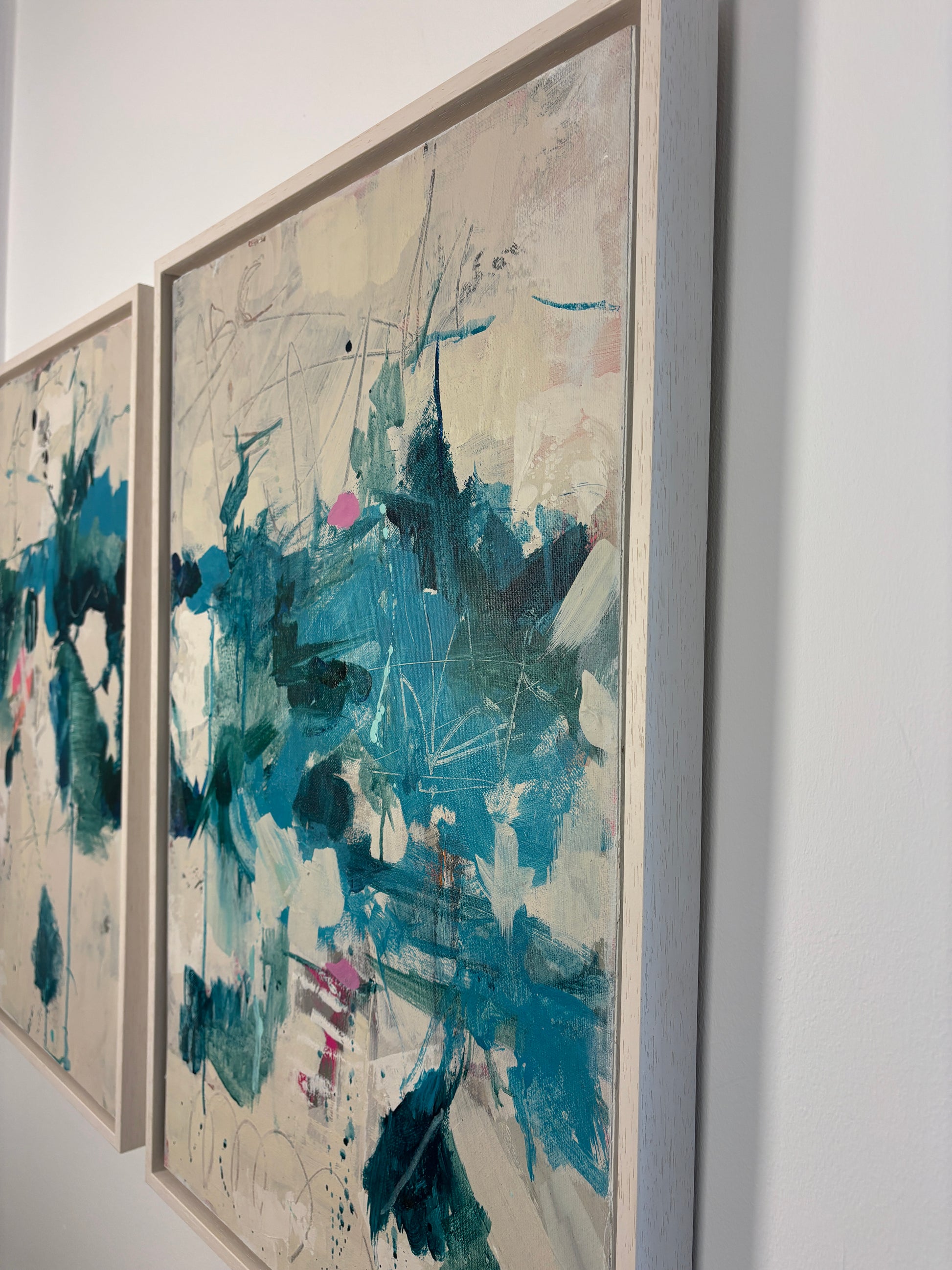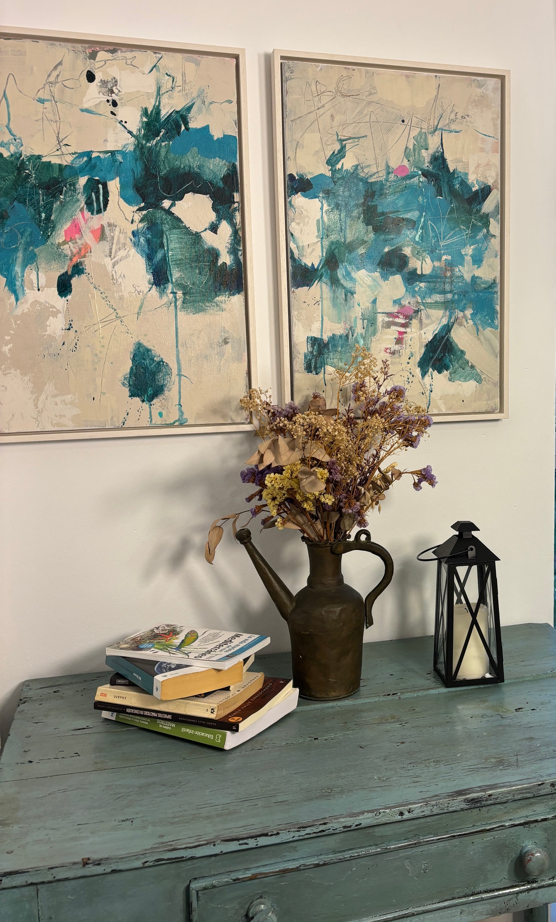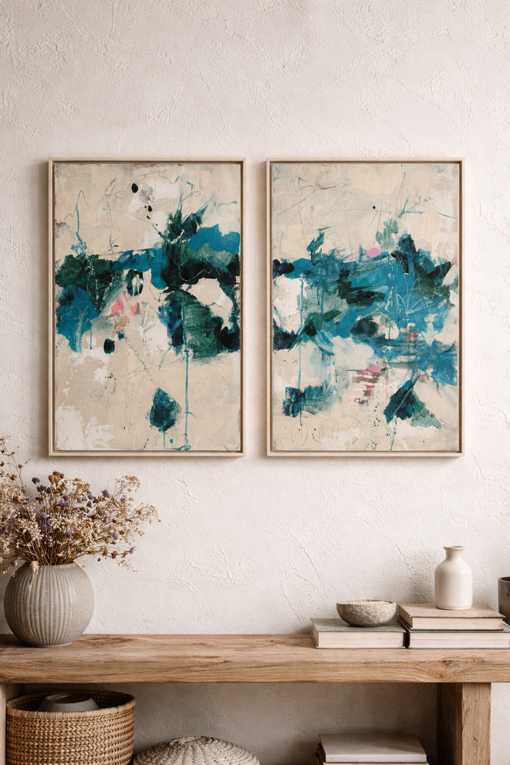 Díptico abstracto en tonos verdes y neutros que aporta equilibrio, movimiento y elegancia al espacio.
